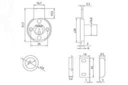 Medida para muebles hasta 30mm de espesor Diametro cilindro 17mm Pines de Bronce Permite igualar combinacion Incluye 2 llaves metalicas Terminacion: Niquel